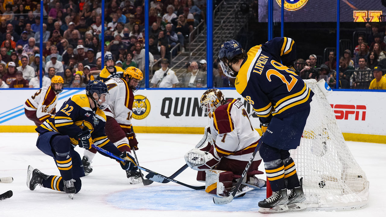 The puck sailed out of play on the first attempt at the extra period’s opening face-off, resulting in a restart. Then it was as if the pro-regulation rink — home to the National Hockey League’s Tampa Bay Lightning — had been tilted like a pinball machine. Jacob Quillan won the draw, tapping the puck to Collin Graf, who fired it backward to Zach Metsa, who slung it ahead to Sam Lipkin, who shoveled it sideways to a streaking Quillan, who deftly steered it over the goal line.