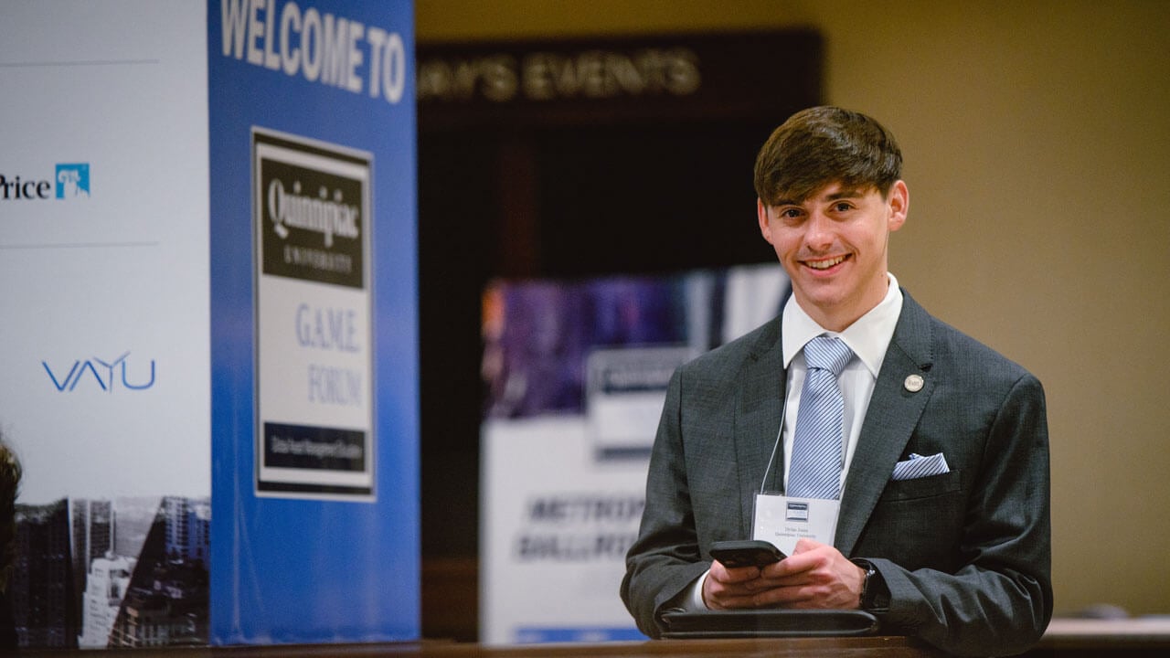 The star power, the sharp commentary, the manic energy, the fancy threads — all the things that first attracted Jones to GAME and Quinnipiac were on display. He had attended the last in-person GAME Forum in 2019 as an admitted student. Jones was so impressed by the professional atmosphere the students had helped cultivate that he knew he had to get involved.