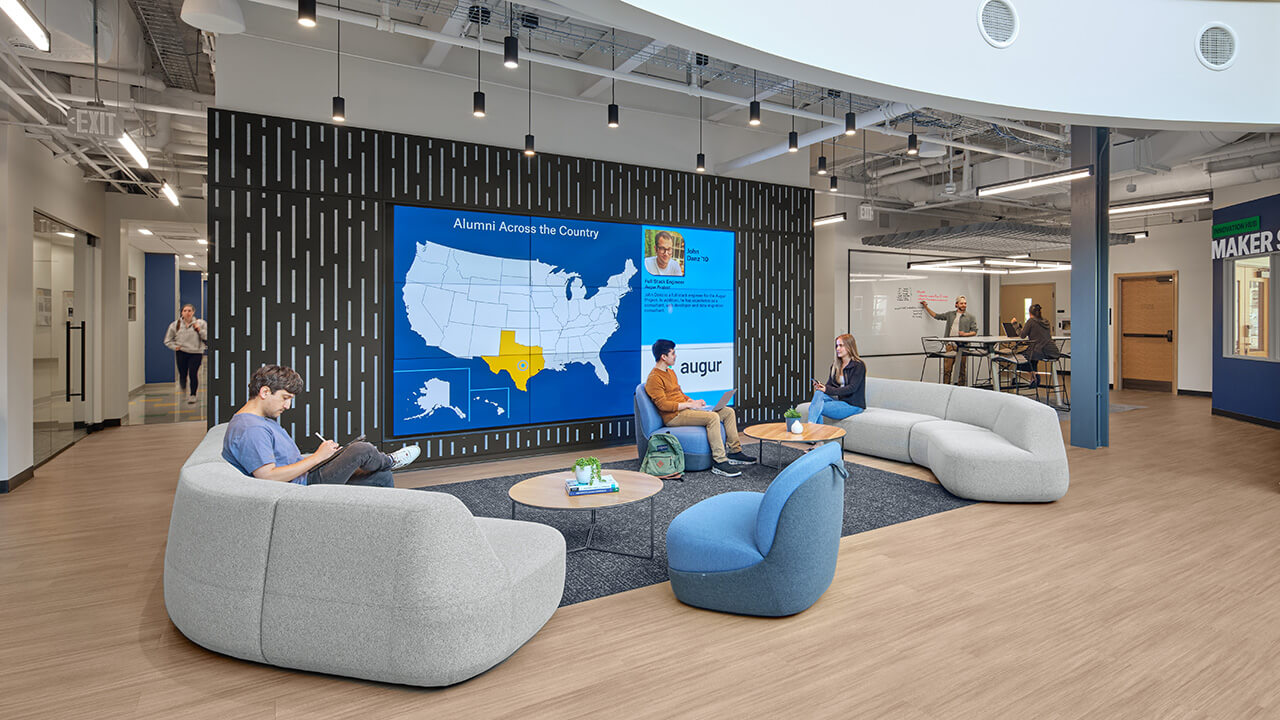 The School of Business features some comfortable and beautifully lit study areas right when you walk in. There are plenty of tables and great spaces for group work, for those working on large projects or who like to study in groups.