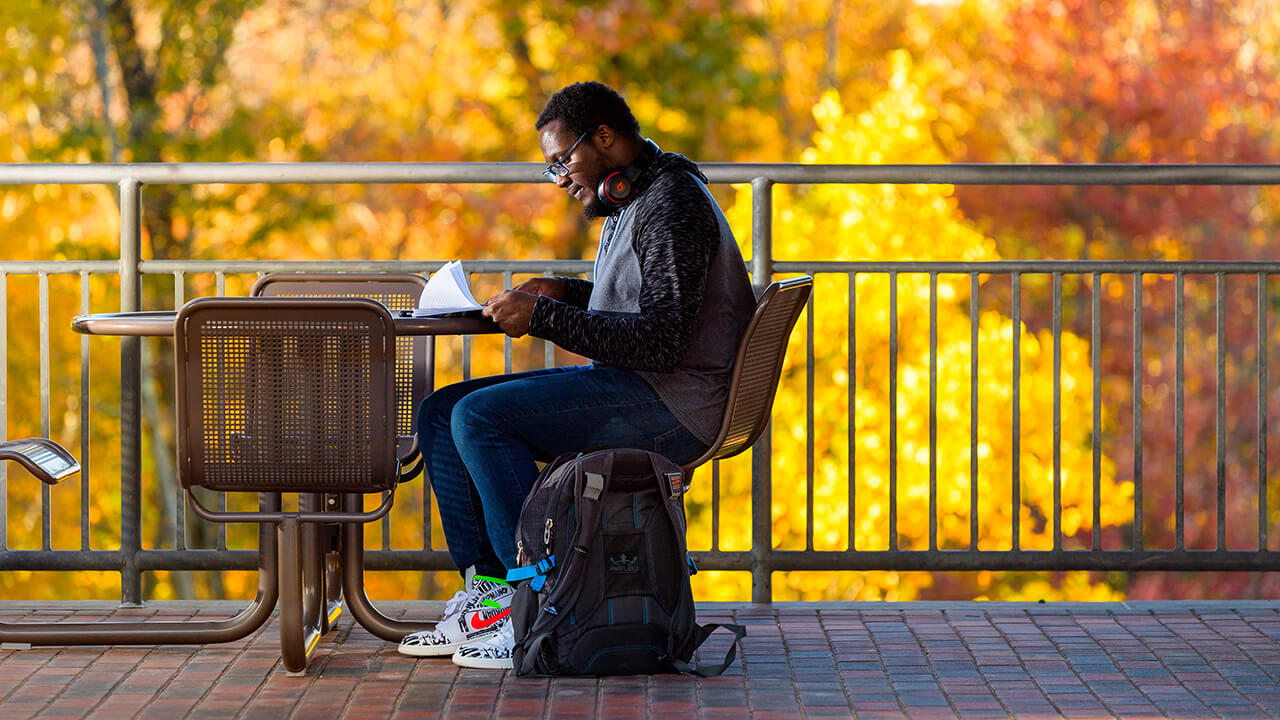 To get a great view of fall foliage without the bustle of the Mount Carmel Campus, head to York Hill to find one of the outdoor seating areas near Crescent or the Rocky Top Student Center.
